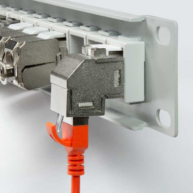 Conector RJ45 blindado para conectar dos latiguillos RJ45. Con función de encaje a presión para su instalación en paneles Keystone de 19 pulgadas. Compatible con cableado Cat. 5e, Cat. 6 y Cat. 6A. Diseño especial en ángulo de 90 grados.