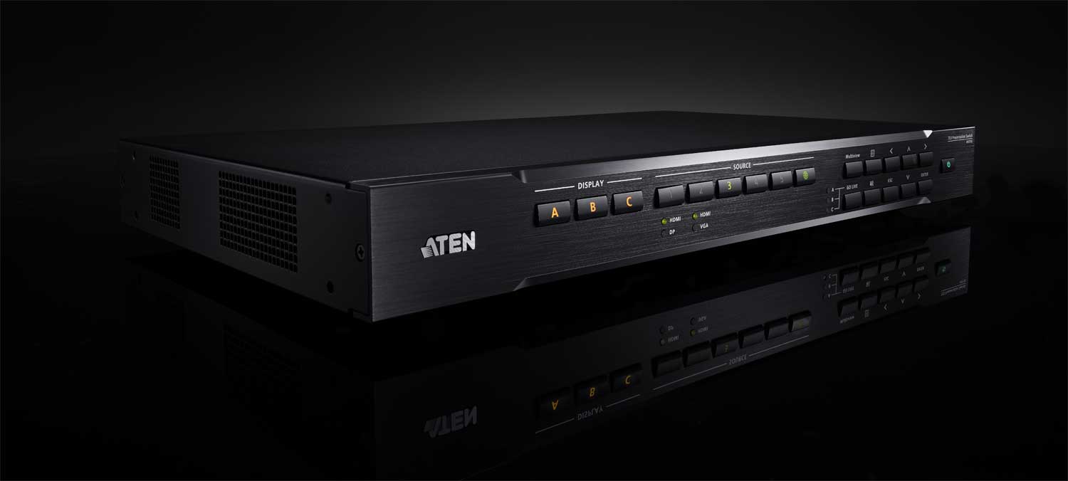 VP2730 es un completo conmutador de presentación que integra un conmutador de matriz de vídeo con funciones de escalador, transmisión, mezclador de audio, extensor HDBaseT y conversor de señal analógica a digital en un dispositivo compacto. Con siete entradas multiformato para dos salidas de alta definición HDMI y una salida HDBaseT, el VP2730 mejora las capacidades de las reuniones de mayor tamaño y facilita la colaboración entre participantes locales y remotos en salas de reuniones, videoconferencias, aulas o clases de formación a distancia.