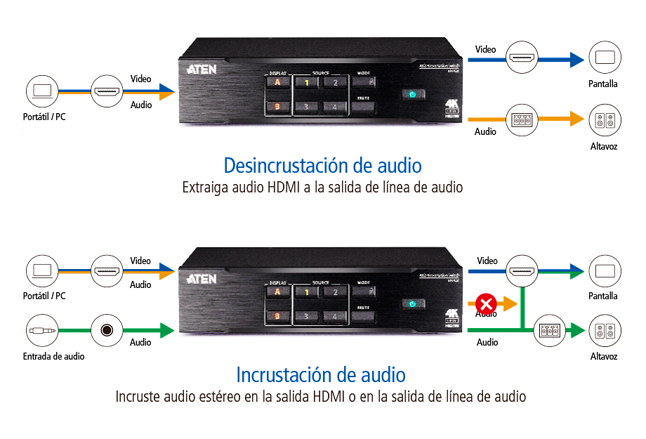 El ATEN VP1420 es un completo conmutador de presentación que integra un conmutador de matriz de vídeo, escalador 4K real, procesador de audio y funciones de conversor de señal analógica a digital en un único dispositivo compacto que se puede montar fácilmente debajo de una mesa o en un bastidor. Con cuatro entradas analógicas/digitales para dos salidas HDMI 4K real, está diseñado para mejorar la eficacia y el impacto de las presentaciones profesionales.
