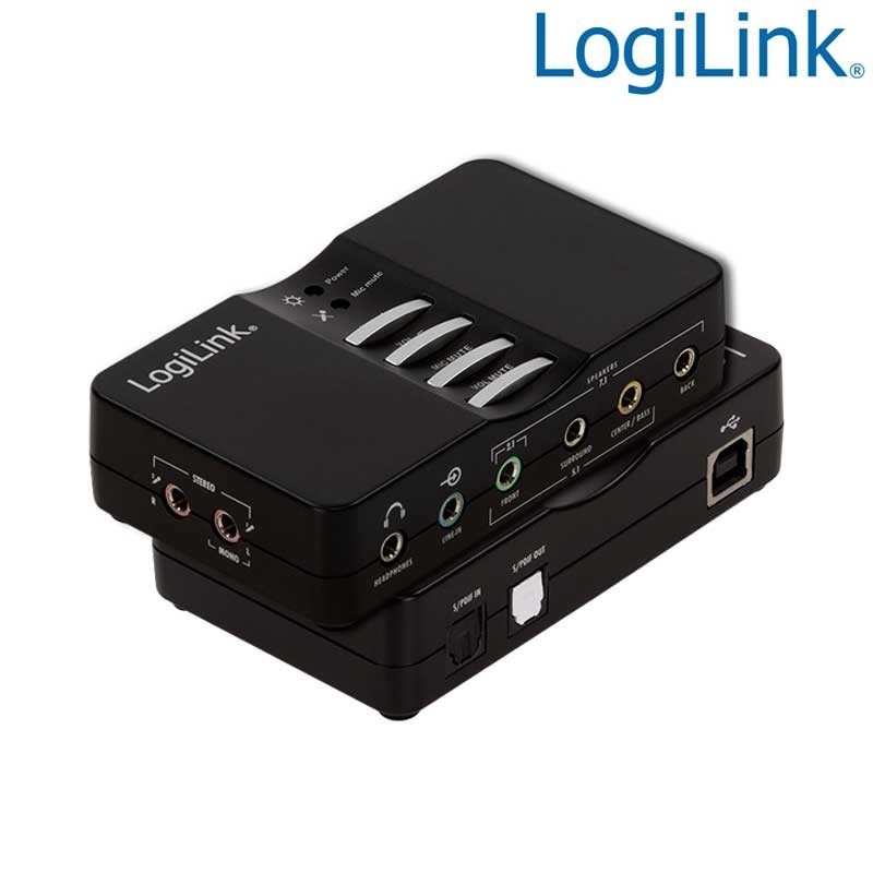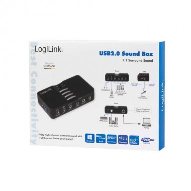 Con la caja de sonido USB 7.1 de LogiLink, convierte su ordenador en una tarjeta de sonido de alta gama. Simplemente conéctelo con el puerto USB 2.0 de su ordenador. Hay múltiples opciones de conectividad disponibles para auriculares y sistemas de altavoces que se pueden conectar hasta 7.1 canales. El procesador de sonido también permite la grabación y reproducción simultáneas.