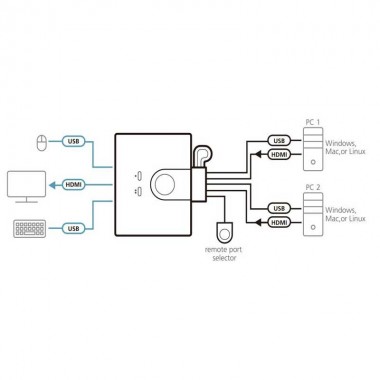 El switch KVM USB FHD HDMI de 2 puertos CS22HF de ATEN es una unidad de control que permite el acceso a dos ordenadores desde una única consola USB y HDMI y ofrece una calidad de vídeo de hasta 1920 x 1080 a 60 Hz o de 1920 x 1200 a 60 Hz. Con el CS22HF, es posible conmutar rápidamente y sin esfuerzo entre dos ordenadores USB HDMI mediante el pulsador del selector de puertos remoto. El CS22HF puede utilizarse para realizar operaciones multiplataforma, lo que permite conmutar entre dos ordenadores con sistemas operativos diferentes.