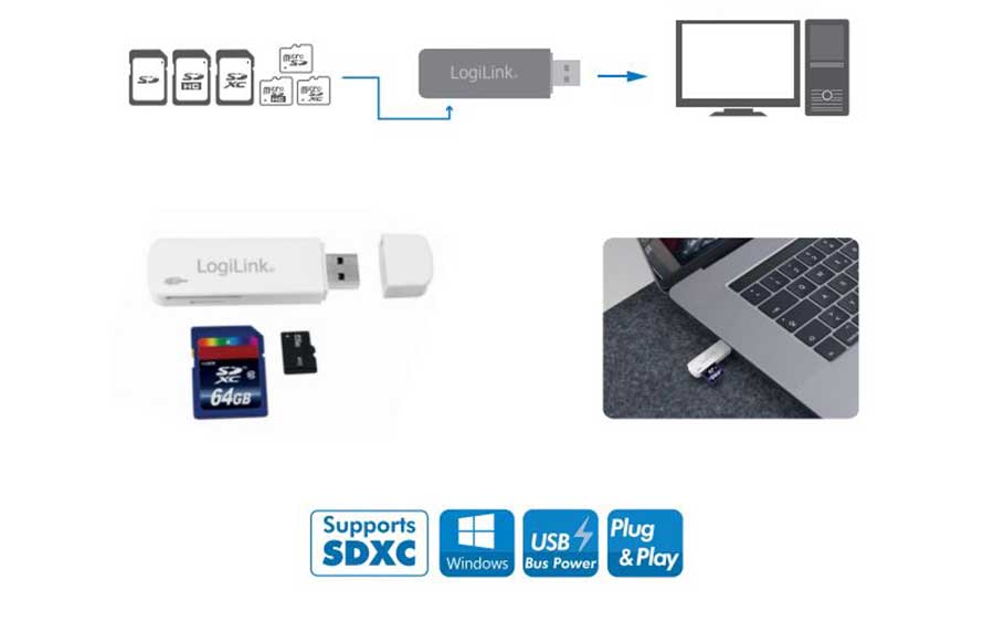 Lector de tarjetas USB 3.0 compacto para leer y escribir SD / SDHC, microSD / SDHC, así como tarjetas SDXC y microSDXC. Está conectado al puerto USB 3.0 y es compatible con USB 2.0 y USB 1.1.