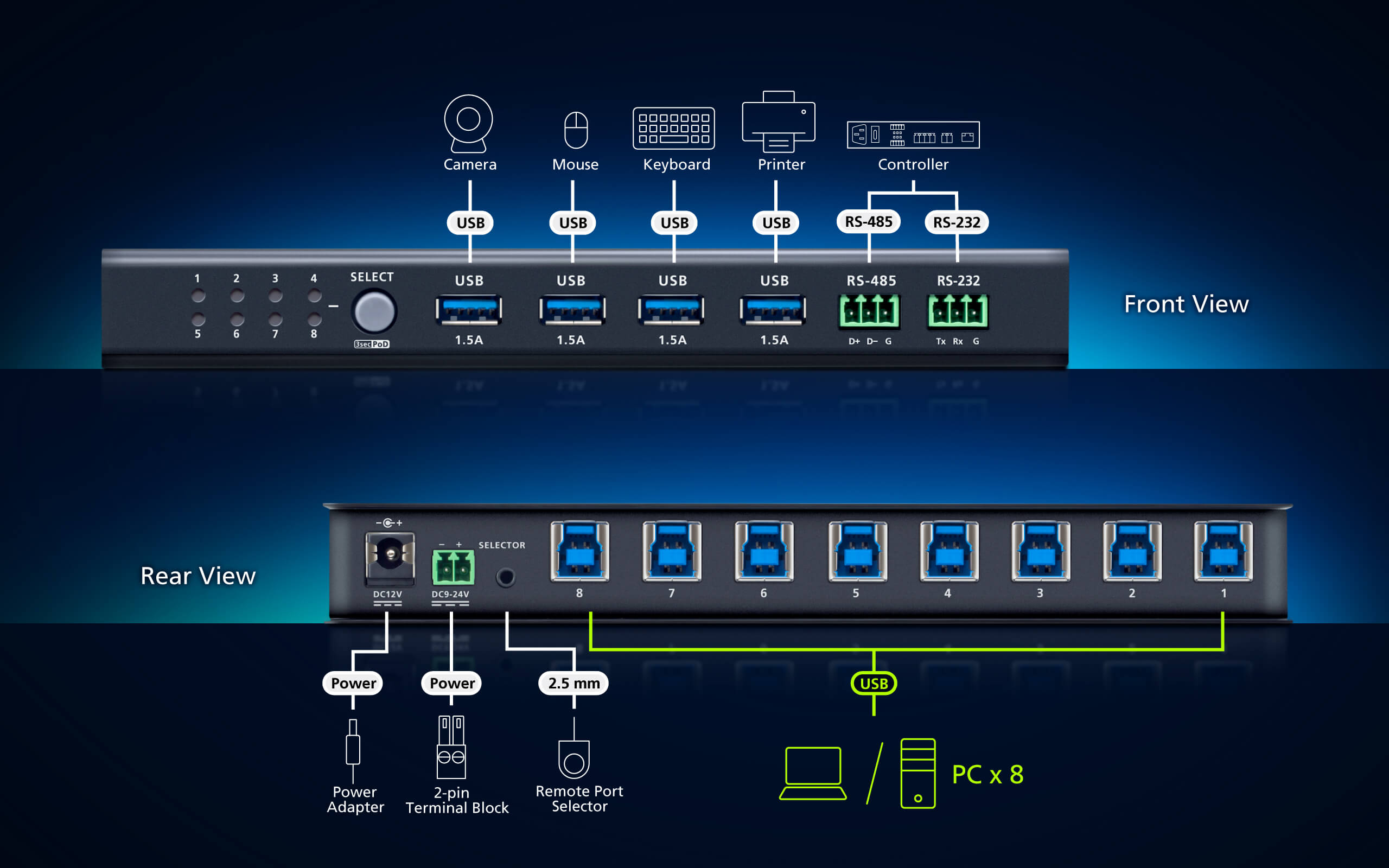 • Métodos versátiles de selección de puertos: botón en el panel frontal, comandos de puerto serie RS-232/RS-485 y selector de puerto remoto externo1
